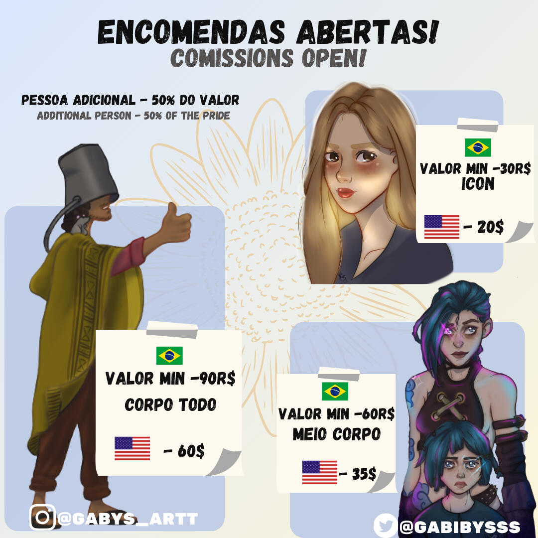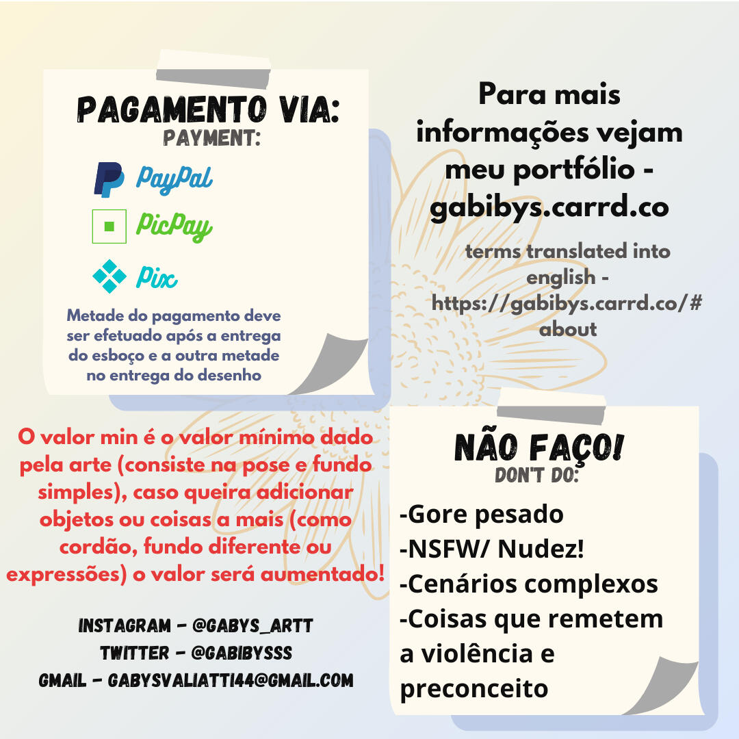 Acima tem todas as informações que precisa para abrir sua comissão, preços e termos.Para mais informações entre em contato comigo em [email protected] ou em Instagram